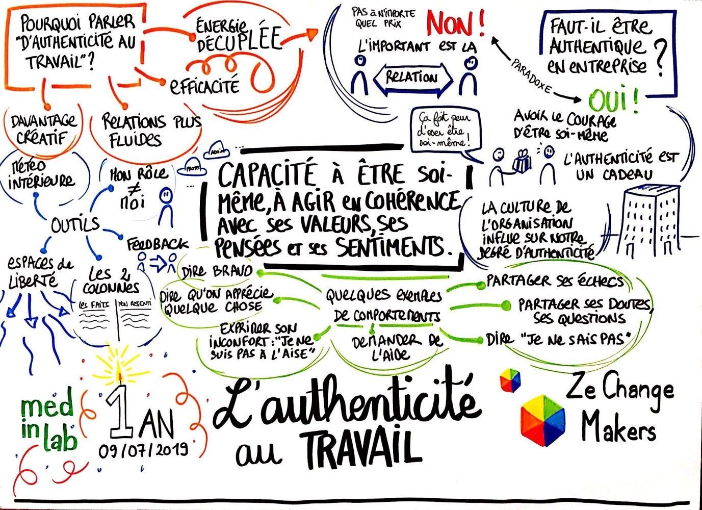 Cette excellente synthèse en sketchnote d'une intervention au MedinLab d'EDF à Marseille en juillet 2019 pose en dessin quelques pistes concrètes pour développer l'authenticité dans les rapports humains.